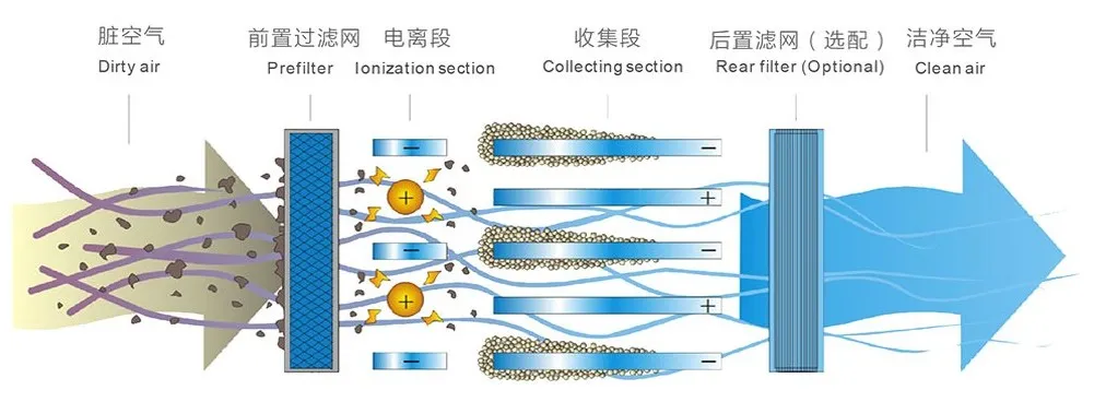 Once the charged ionic particles reach the plate adsorption zone, they are immediately adsorbed. The oil droplets then flow back to the bottom oil collection basin under vertical gravity. After multi-stage treatment, the purified gas meets environmental requirements or pre-treatment design standards.
