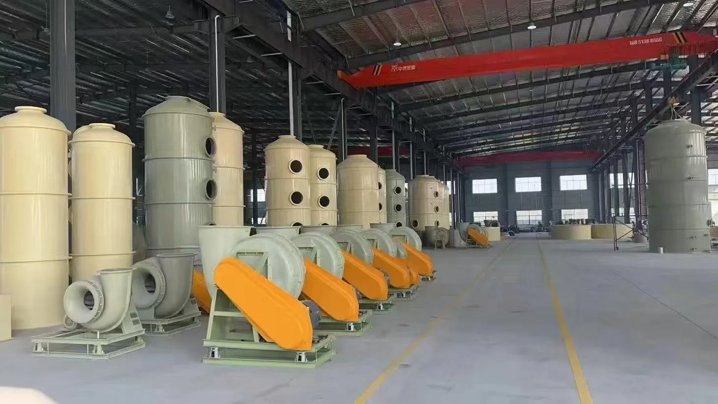 Gas is fed into the FRP absorption tower by a fan, flowing from bottom to top. The absorption liquid is pumped to the top of the tower and uniformly sprayed downwards, creating a counter-current absorption. The neutralized gas passes through the demisting section and is then discharged into the atmosphere. Different acidic gases are absorbed by different absorption liquids, achieving high purification efficiencies (e.g., >98% for HCl mist, >97% for H₂SO₄ mist, >90% for HNO₃ mist, >95% for cyanide-containing waste gas).