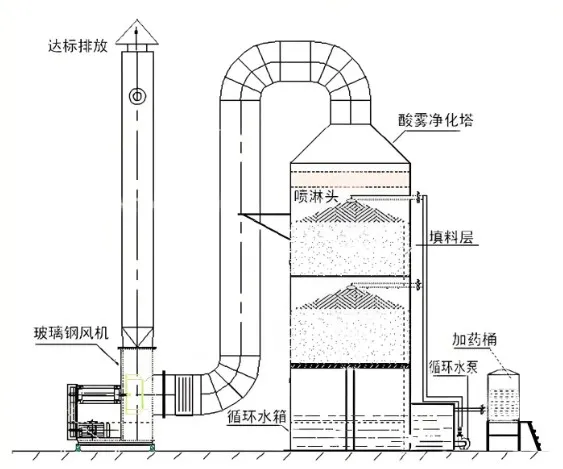 Waste gas containing sulfuric acid mist enters from the bottom of the tower body and flows upwards under the action of an induced draft fan. The spray system at the top of the tower atomizes an alkaline absorption liquid (commonly 10% sodium hydroxide solution or 8% sodium carbonate solution) and sprays it downwards, creating a counter-current gas-liquid contact environment. The sulfuric acid mist reacts with the absorption liquid to neutralize: H₂SO₄ + 2NaOH = Na₂SO₄ + 2H₂O (or H₂SO₄ + Na₂CO₃ = Na₂SO₄ + H₂O + CO₂↑), forming soluble sodium sulfate, thus converting gaseous pollutants into liquid substances. The acid-resistant packing inside the tower (such as PP Pall rings, multi-faceted hollow balls) further enhances the purification effect. The liquid film formed on the surface of the packing increases the gas-liquid contact area, and tiny sulfuric acid mist particles not directly neutralized are adsorbed by the liquid film, condense, and flow into the circulating water tank at the bottom of the tower with the liquid. The purified gas passes through the demisting layer at the top of the tower (usually a baffle or mesh) to remove entrained liquid droplets, finally meeting emission standards.